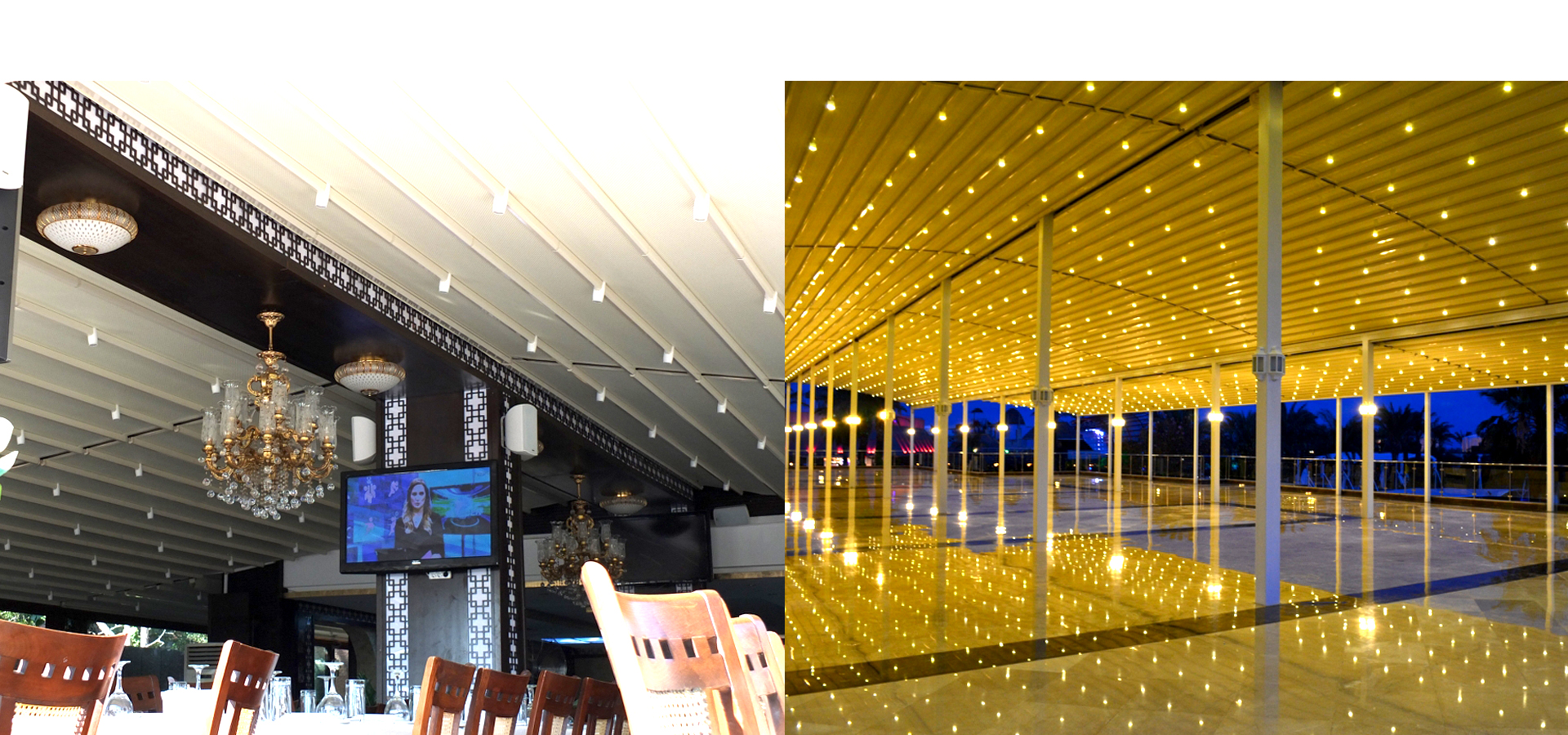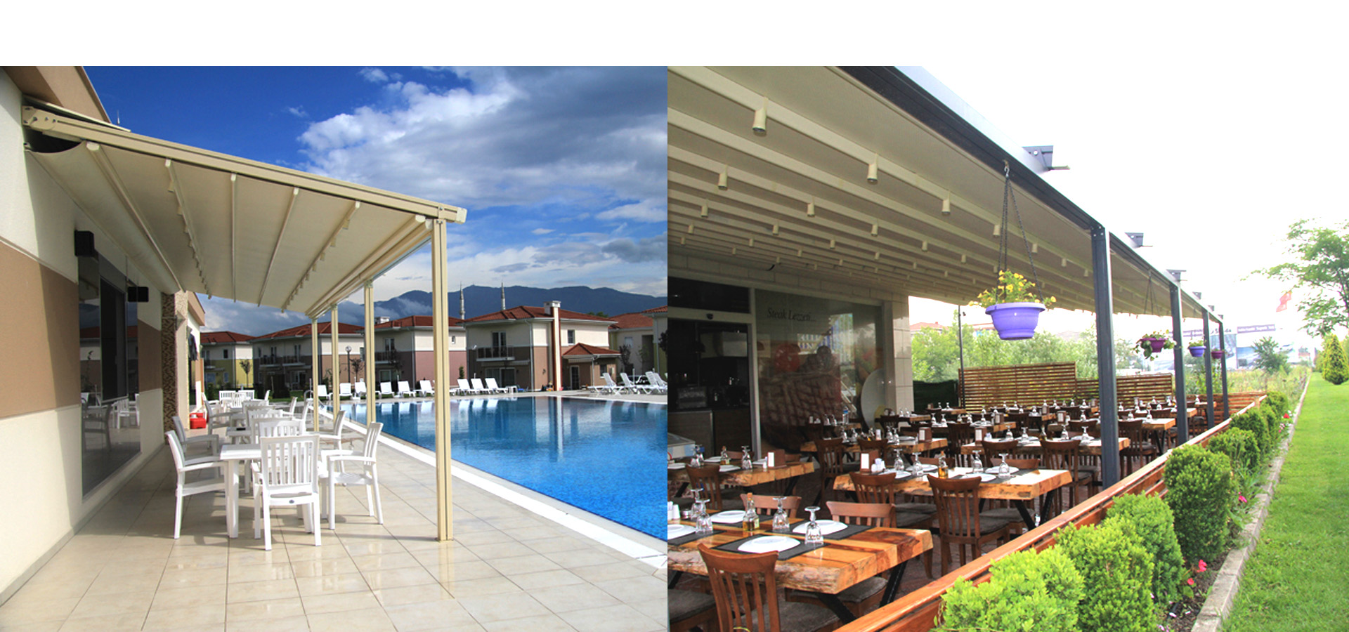 Cafe restoran ve barların tercihi olan bu tente çeşitleri, isteğe bağlı olarak kumanda sistemiyle kontrol edilebilir.